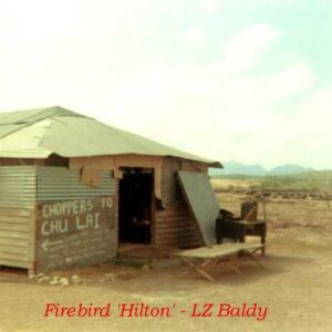 Although home based with the Rattlers base camp at Chu Lai, the Firebirds mission was the around the clock standby at LZ Baldy some 45 miles north of Chu Lai. Two gunships provided fire support to the 196th LIB units. Crew rotations occurred every two or three days depending on the mission requirements. The Baldy staging area included a rustic tin-roofed shack that was a quick reaction operations center and combined crew dormitory.