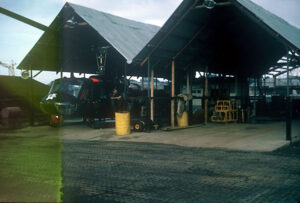 A large open-air hangar accommodated helicopters undergoing periodic or other maintenance and repair activities. The maintenance hangar functioned around the clock. Airframe repairs, sheet metal fabrication, turbine engine cleaning was a continuous non-stop event. A large separate platoon was devoted to this operation. The simpler dailies (daily maintenance) and pre & post flight inspections were the routine repertoire.