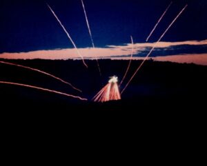 We fly several ‘hot’ passes over the darkened perimeter. When Suber releases his next pair of rockets I watch in stunned horror as they crossed and collided in mid-flight. The rockets ‘kissed’ in mid-flight, one rocket veering sharply to the left and downward – striking directly inside the Baldy perimeter.